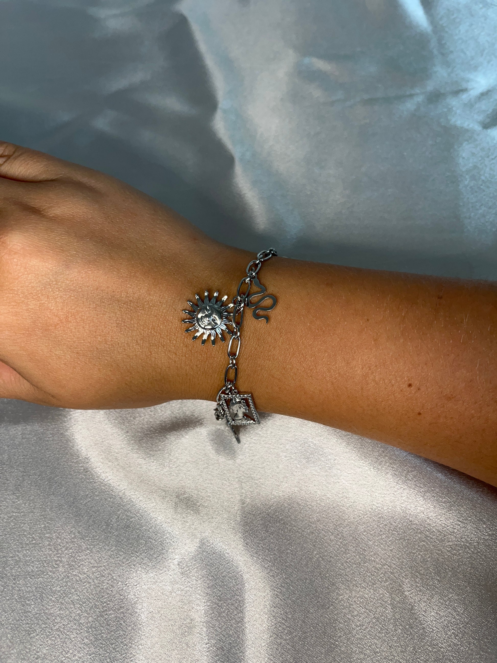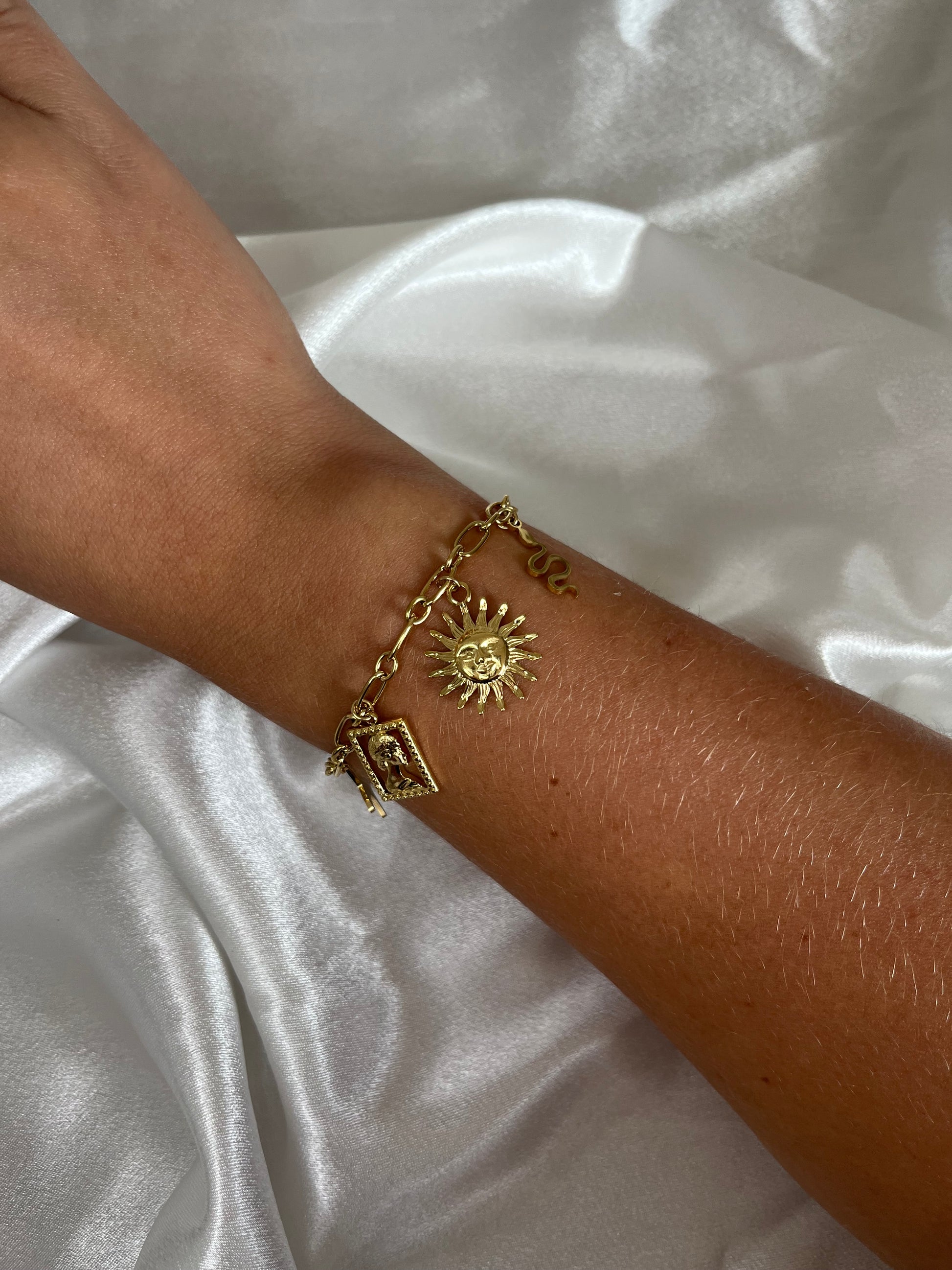 Original et audacieux, le bracelet CHARM’S JEANNE se distingue par sa chaîne à gros maillons ornée de multiples breloques symboliques. Soleil, cœur, étoile, serpent… chaque détail apporte une touche unique et raconte une histoire.