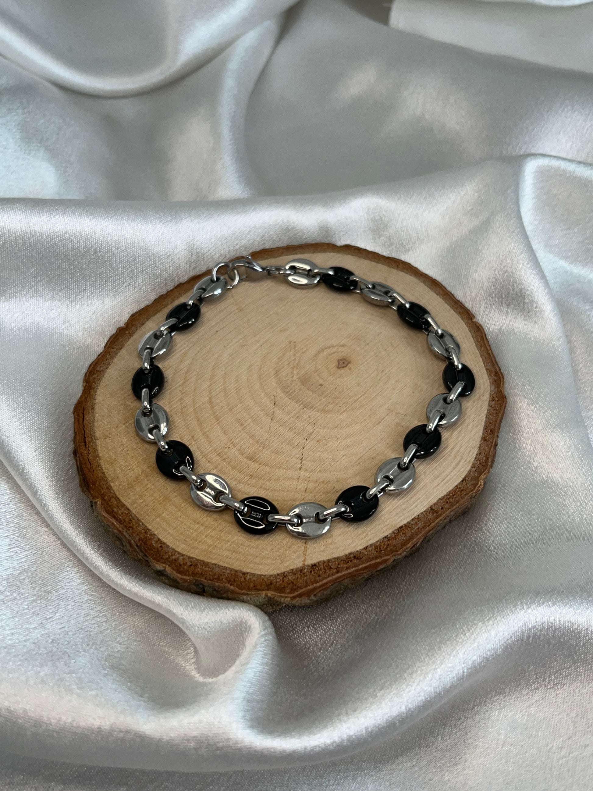 Élégant et intemporel, ce bracelet grain de café associe l’acier inoxydable argenté et des maillons noirs pour un style moderne et masculin.