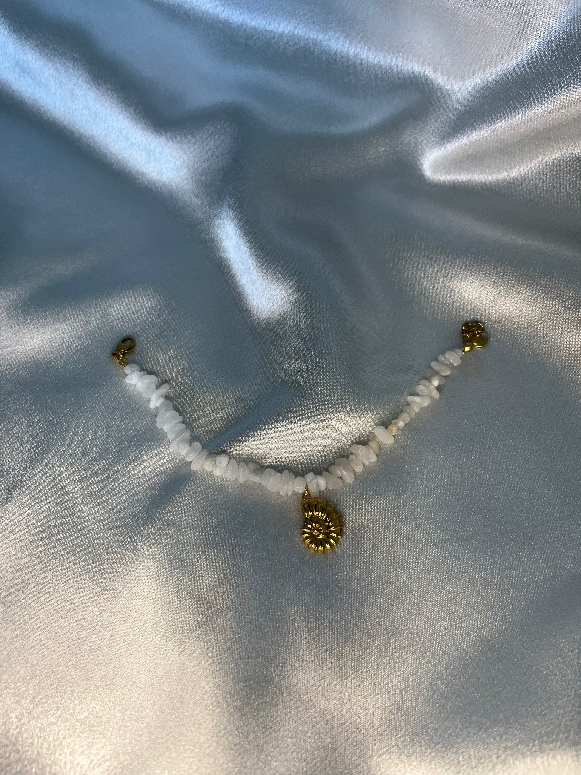 Inspiré par l’océan, le bracelet MAYA associe de petites perles naturelles blanches à une délicate breloque coquillage dorée. Un bijou bohème chic, parfait pour la belle saison.