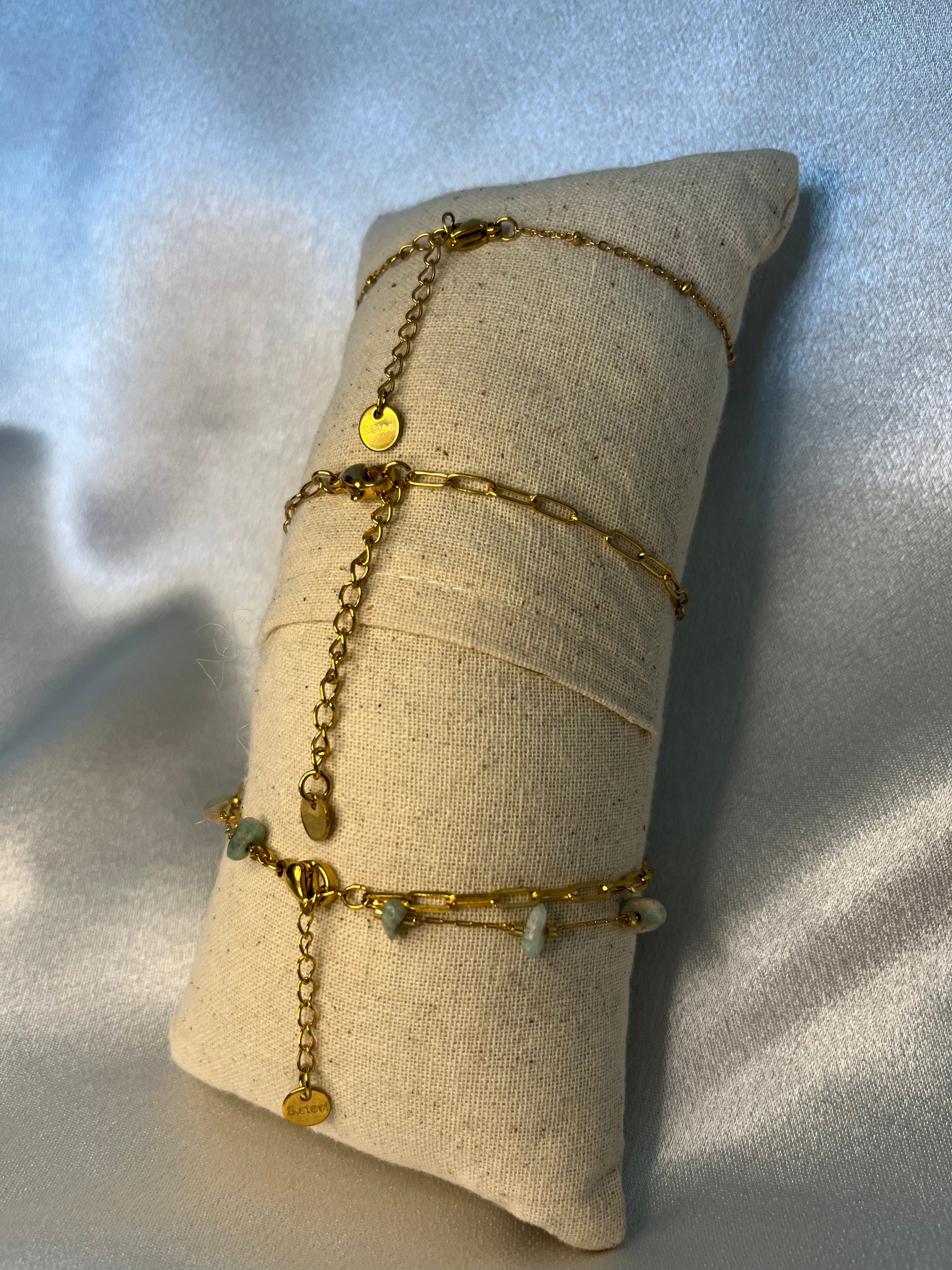 - Double Perla : double chaîne dorée rehaussée de petites perles vert d’eau