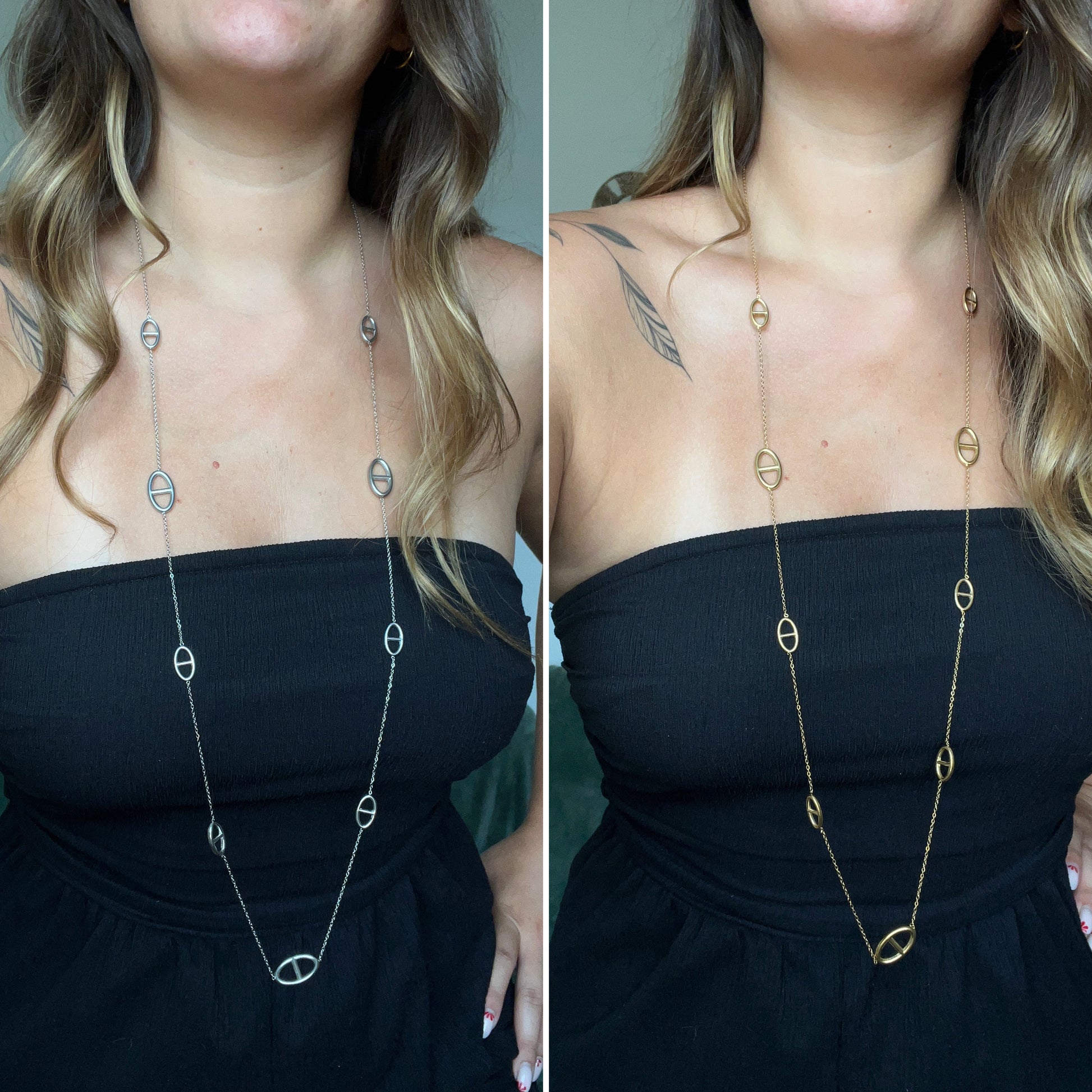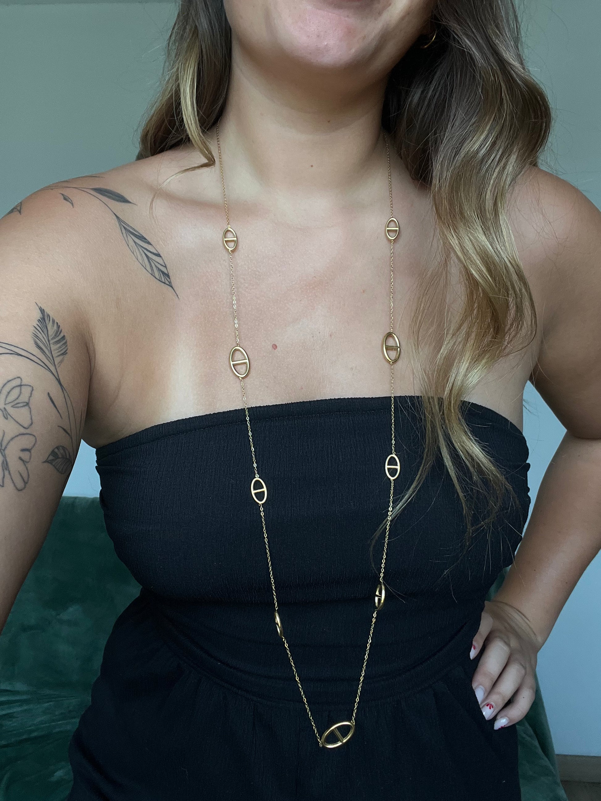Le collier long MAËLYS apporte élégance et légèreté à vos tenues. Son design minimaliste fait un bijou intemporel, facile à porter au quotidien comme en soirée.