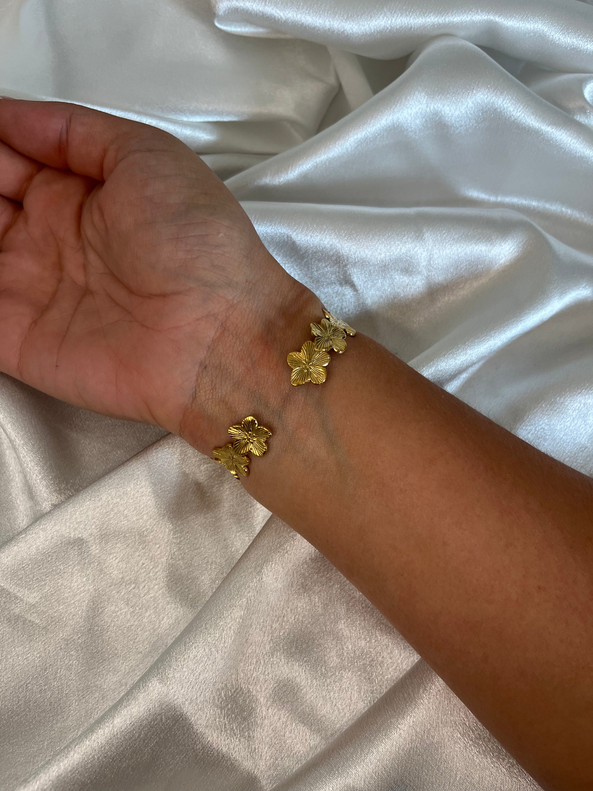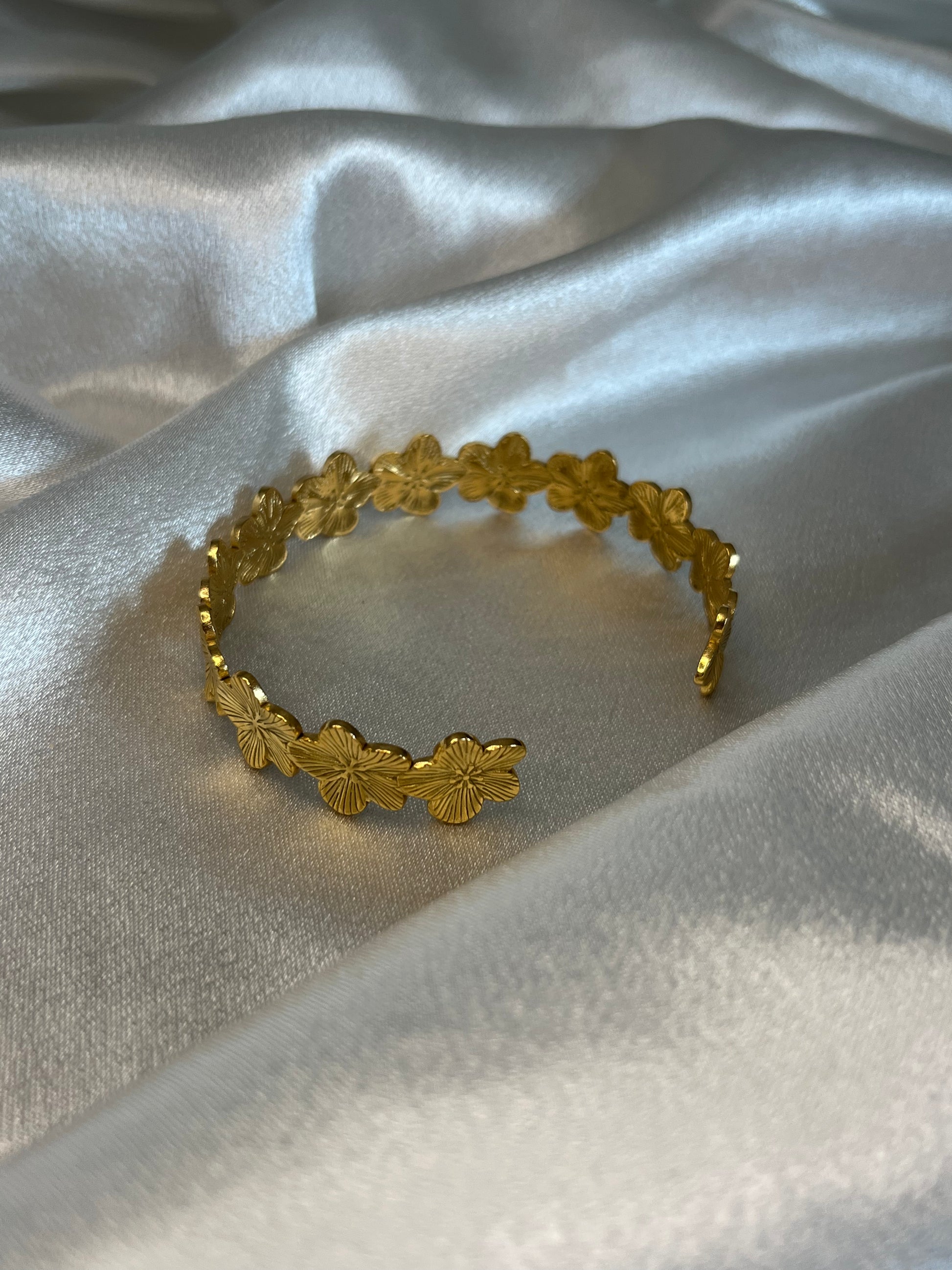 Le jonc FLAVIE se distingue par ses délicates fleurs en relief qui s’enchaînent pour former un bijou lumineux et élégant. Une pièce sophistiquée qui apporte instantanément une touche chic à ton poignet.