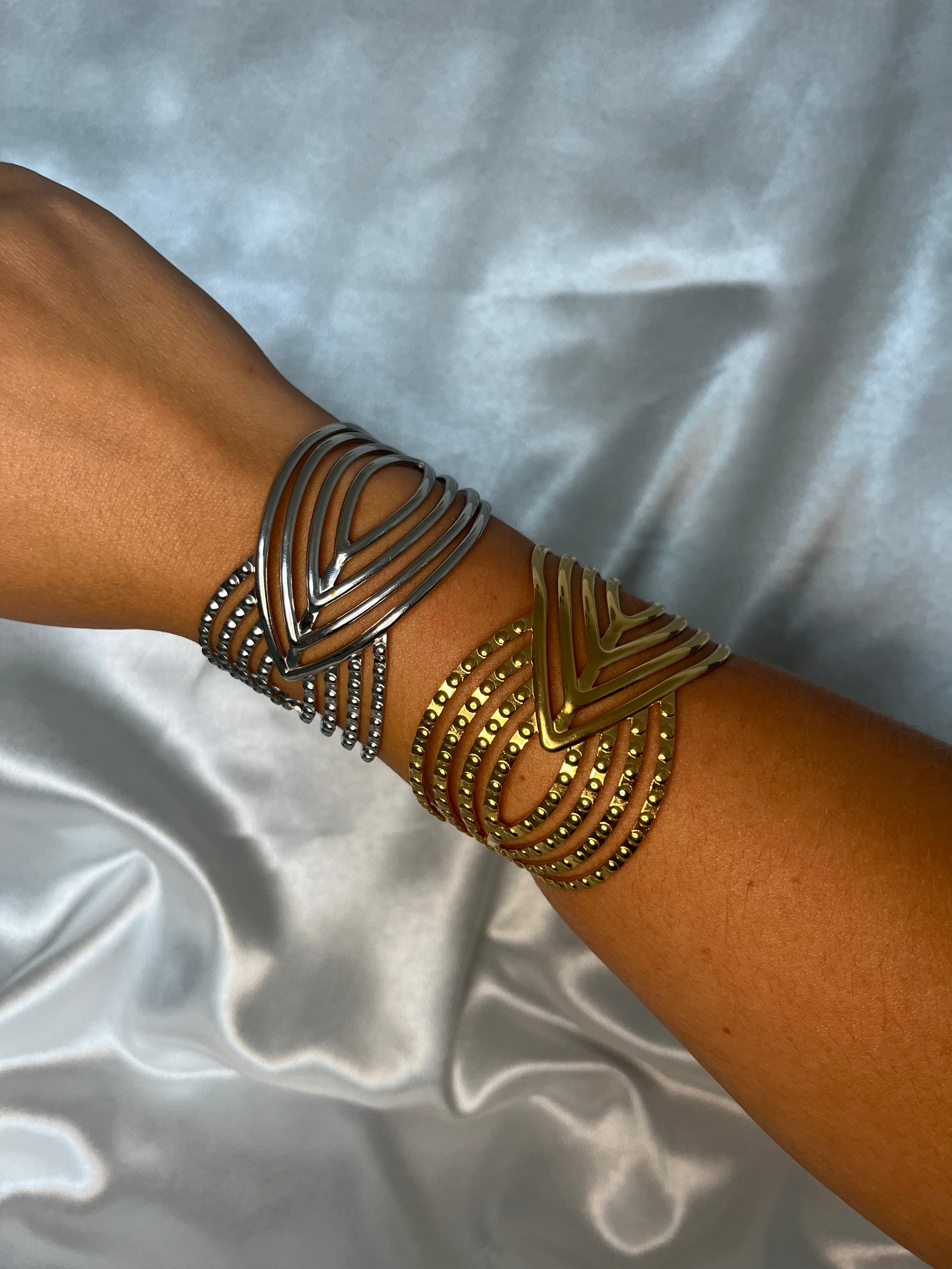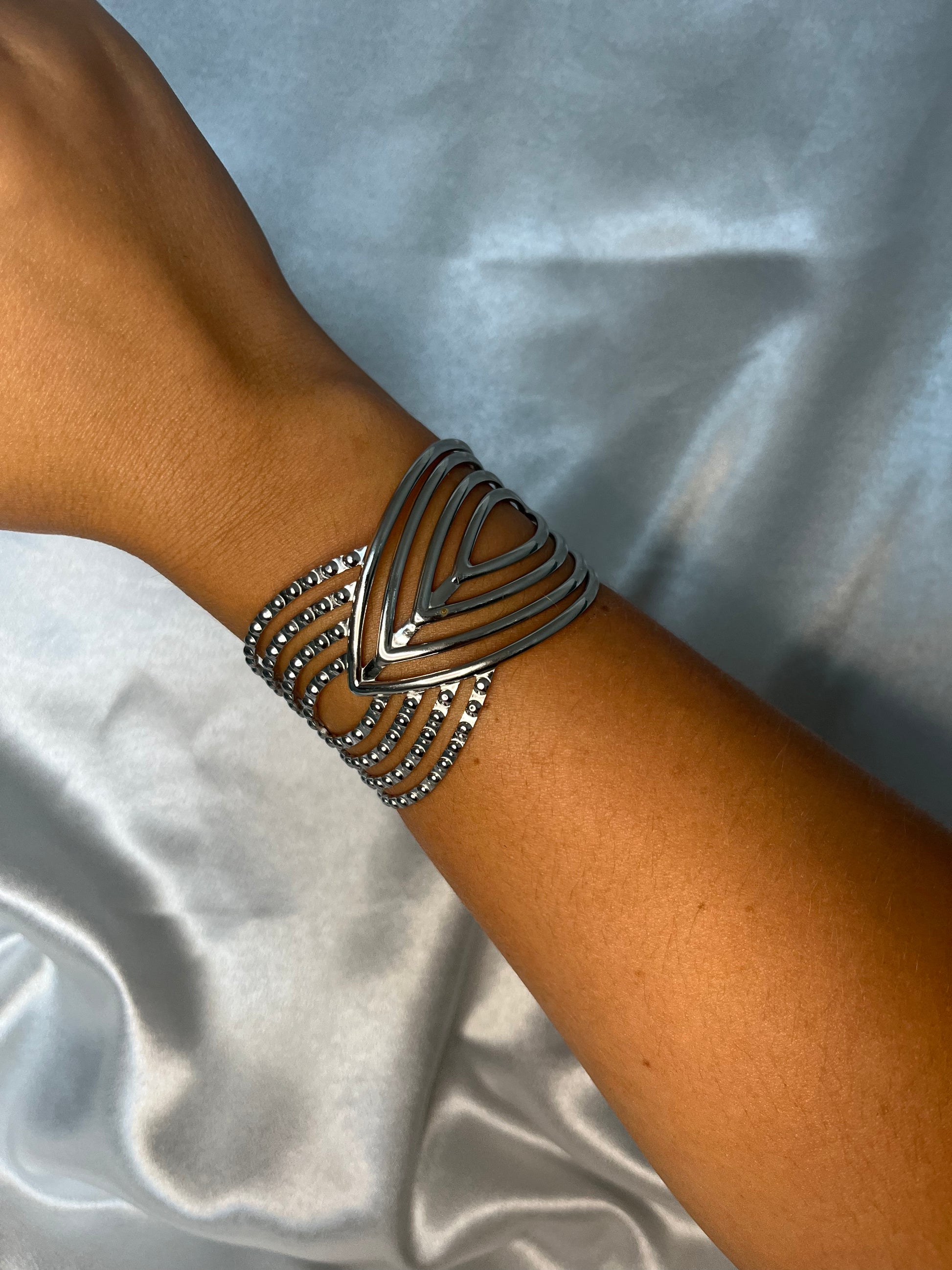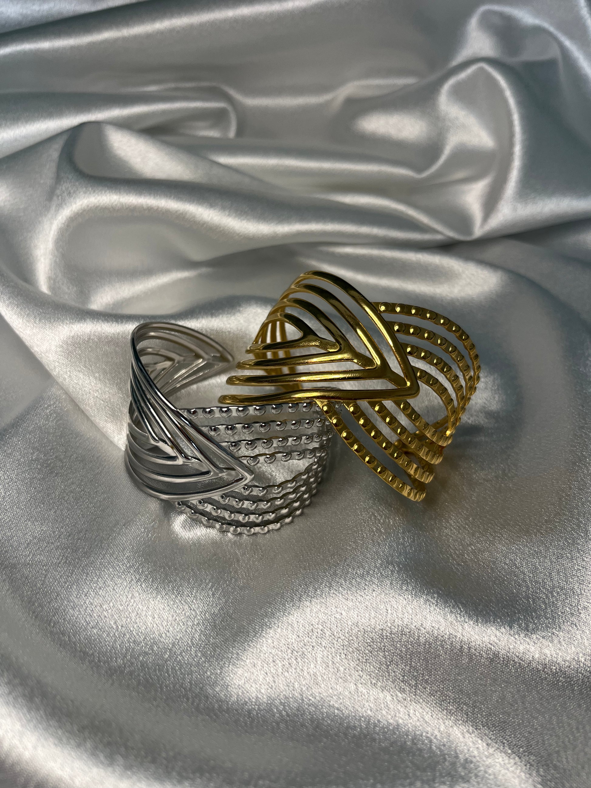 Élégante et moderne, la manchette MARIE habille le poignet avec caractère. Son design ajouré en forme de chevrons lui donne un style unique, à la fois chic et audacieux.