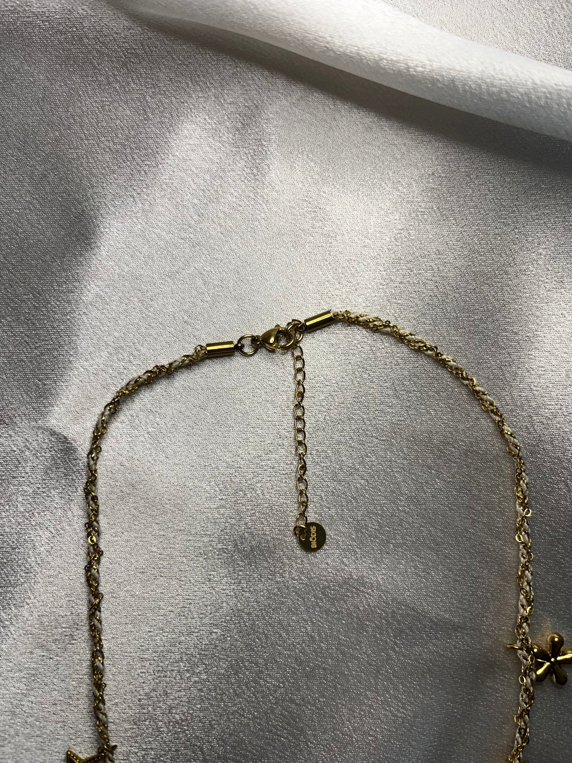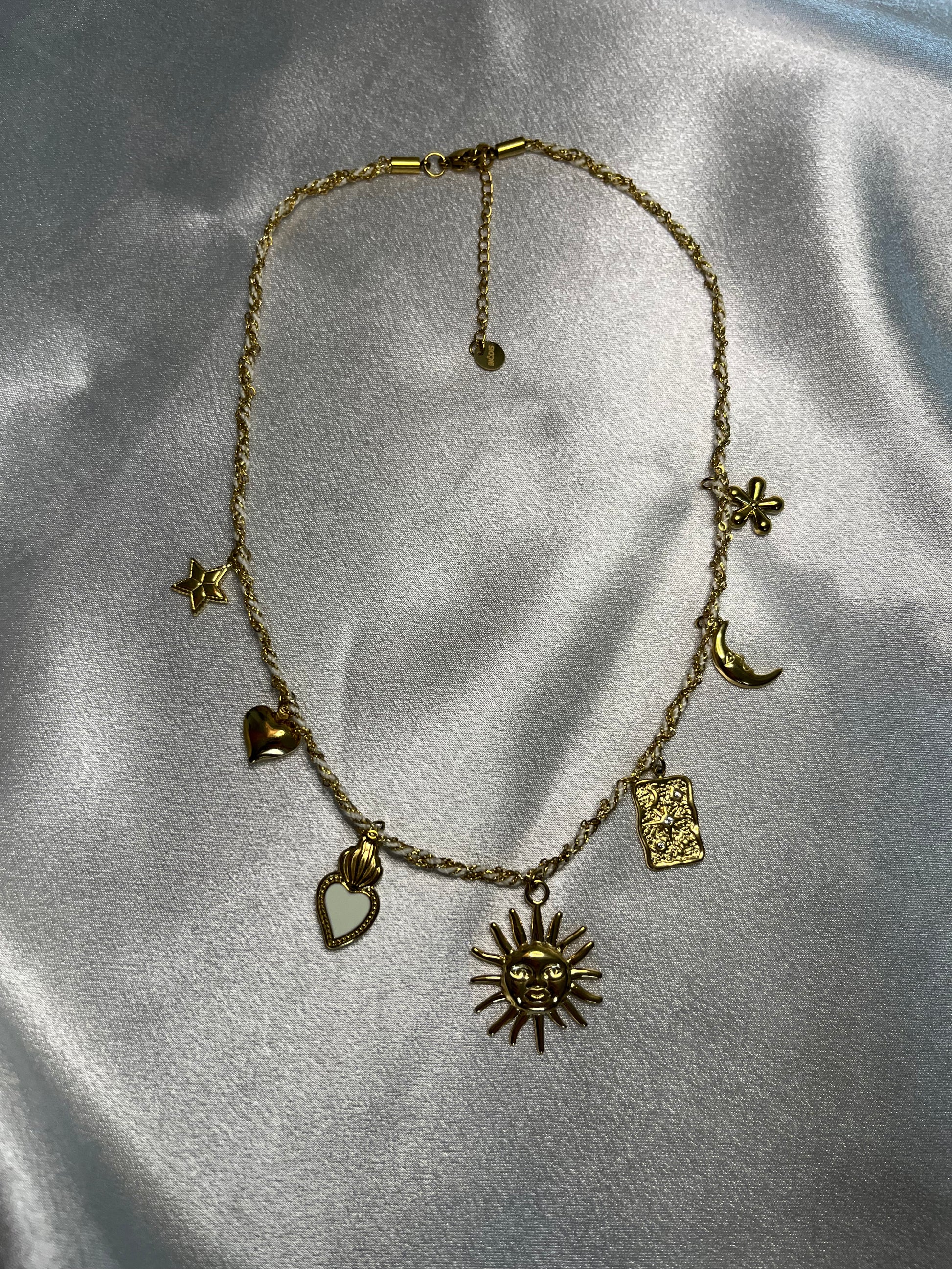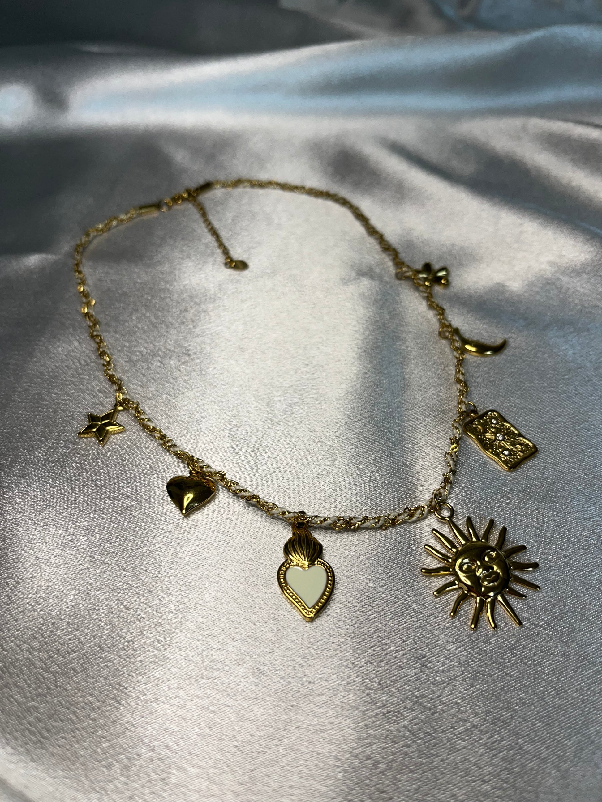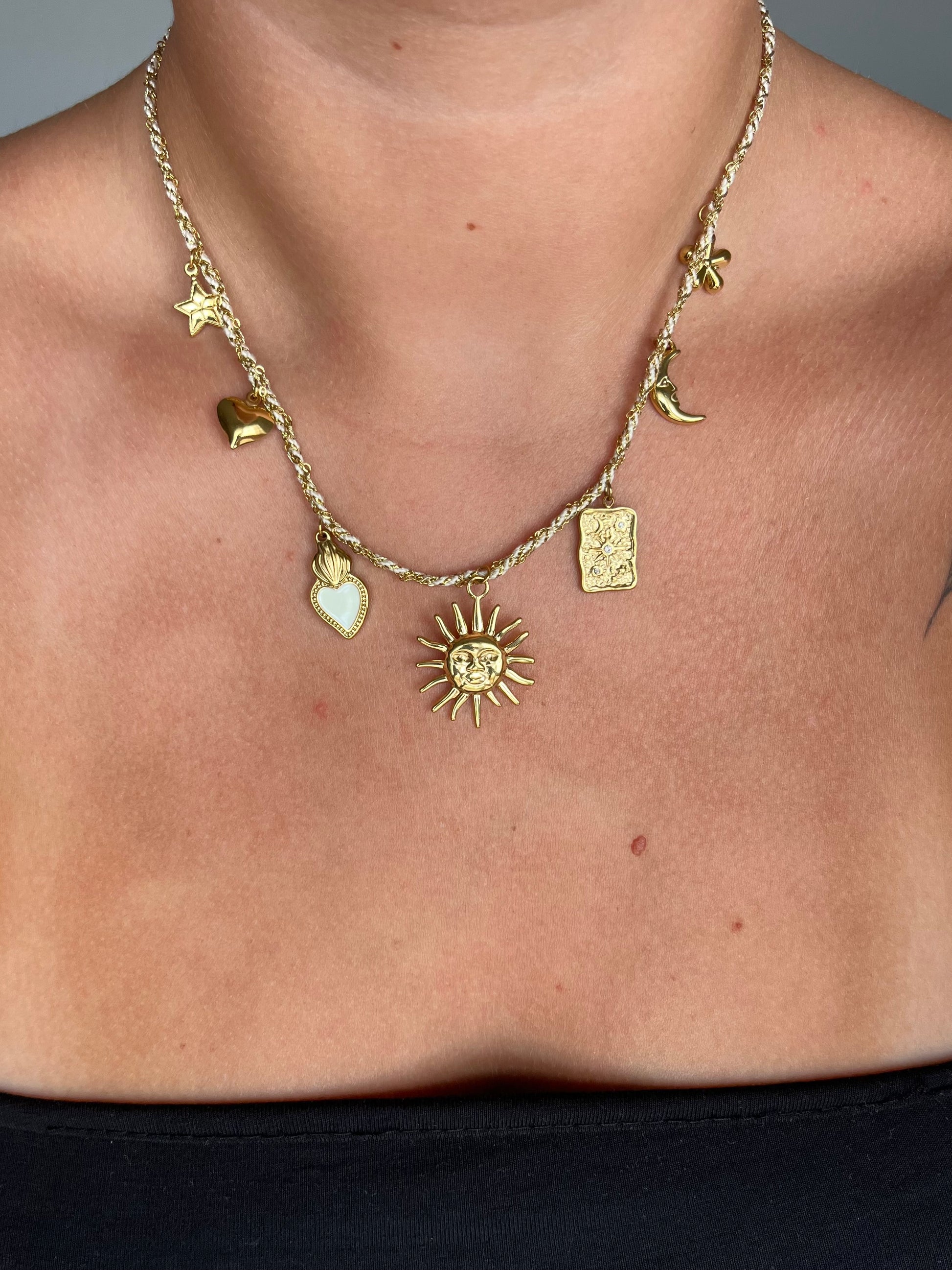 Véritable bijou porte-symboles, le collier SOLINE associe une chaîne torsadée raffinée à une série de charms dorés : soleil, lune, cœur, étoile et pendentif gravé.