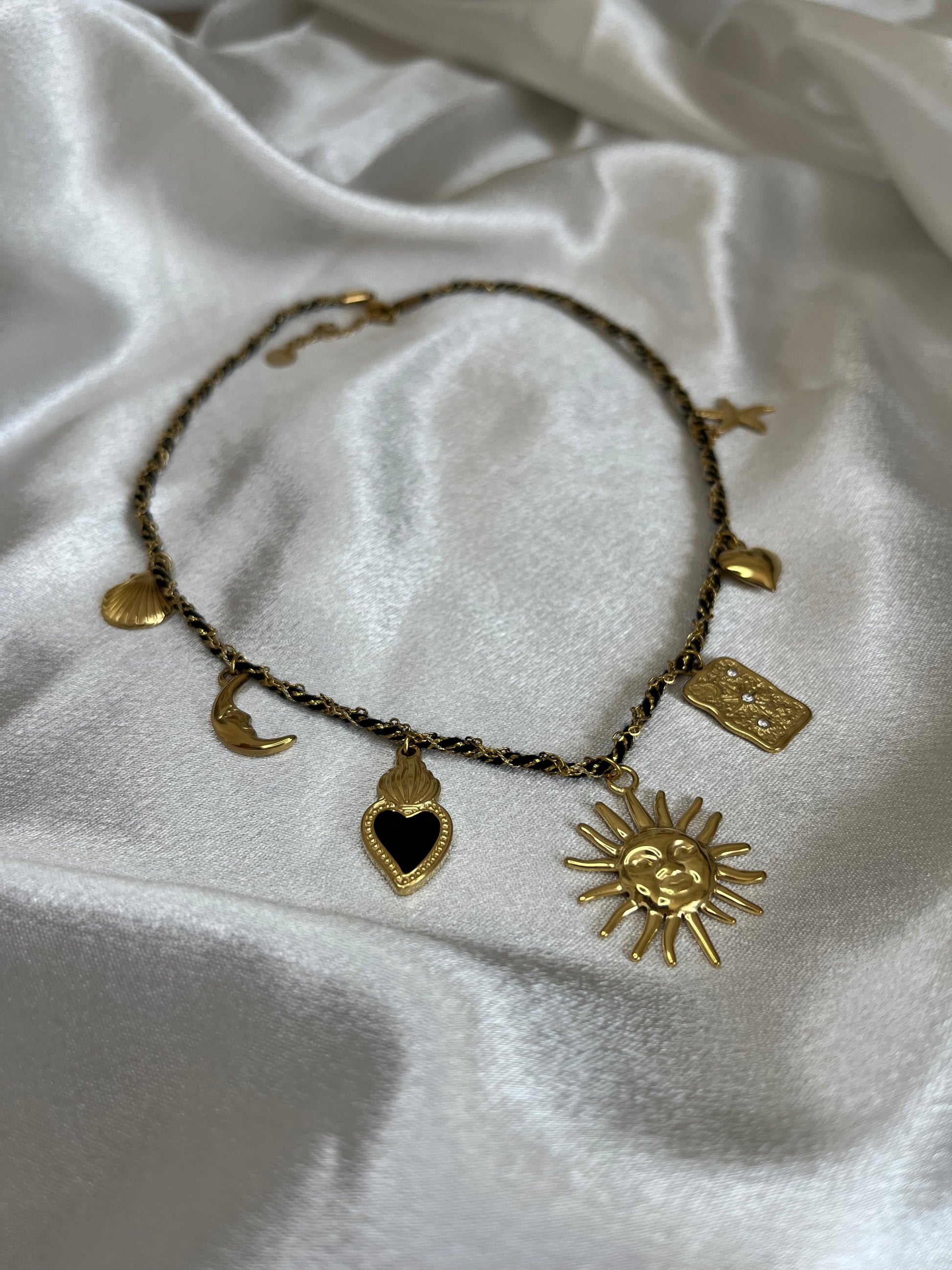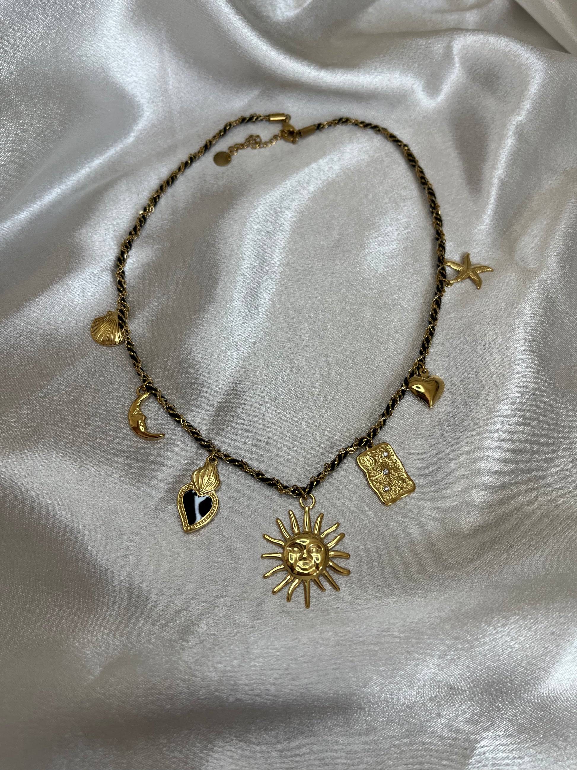 Véritable bijou porte-symboles, le collier SOLINE associe une chaîne torsadée raffinée à une série de charms dorés : soleil, lune, cœur, étoile et pendentif gravé.